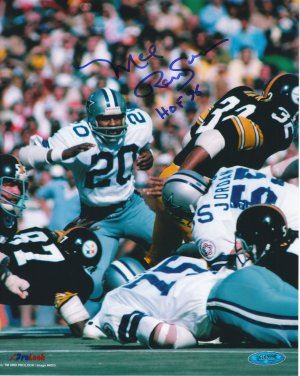 Mel Renfro was drafted by the Cowboys in the second round of the 1964 NFL Draft. He was initially placed as a safety, but was switched to cornerback in his fifth season. The speedy Renfro (4.65 40-yd dash) became an exceptional threat to wide receivers. Mel led the NFL with 10 interceptions in 1969. Renfro was selected to the Pro Bowl in each of his first ten seasons in the League, including five All-Pro selections in 1964, 1965, 1969, 1971, and 1973. Mel Renfro has hand autographed this Dallas Cowboys 8x10 Color Photo with HOF 96 inscription. Tri-Star Hologram and Certificate of Authenticity.