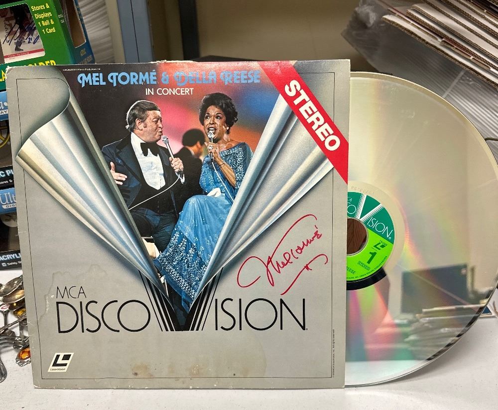 The cover shows noticeable staining along the bottom edge and general shelf wear. The corners appear slightly soft. The autograph is clear and legible. The disc is not in its inner sleeve.