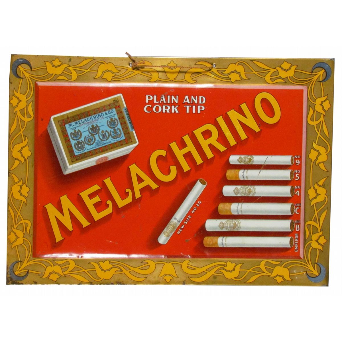 Melachrino Tin Over Cardboard String Hanger Sign. Edgewear otherwise good condition. 13 1/2 X 9 1/2 inches.