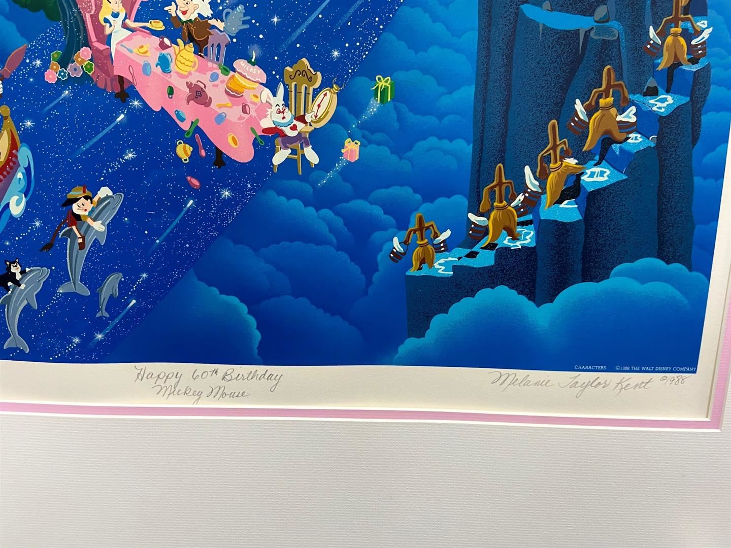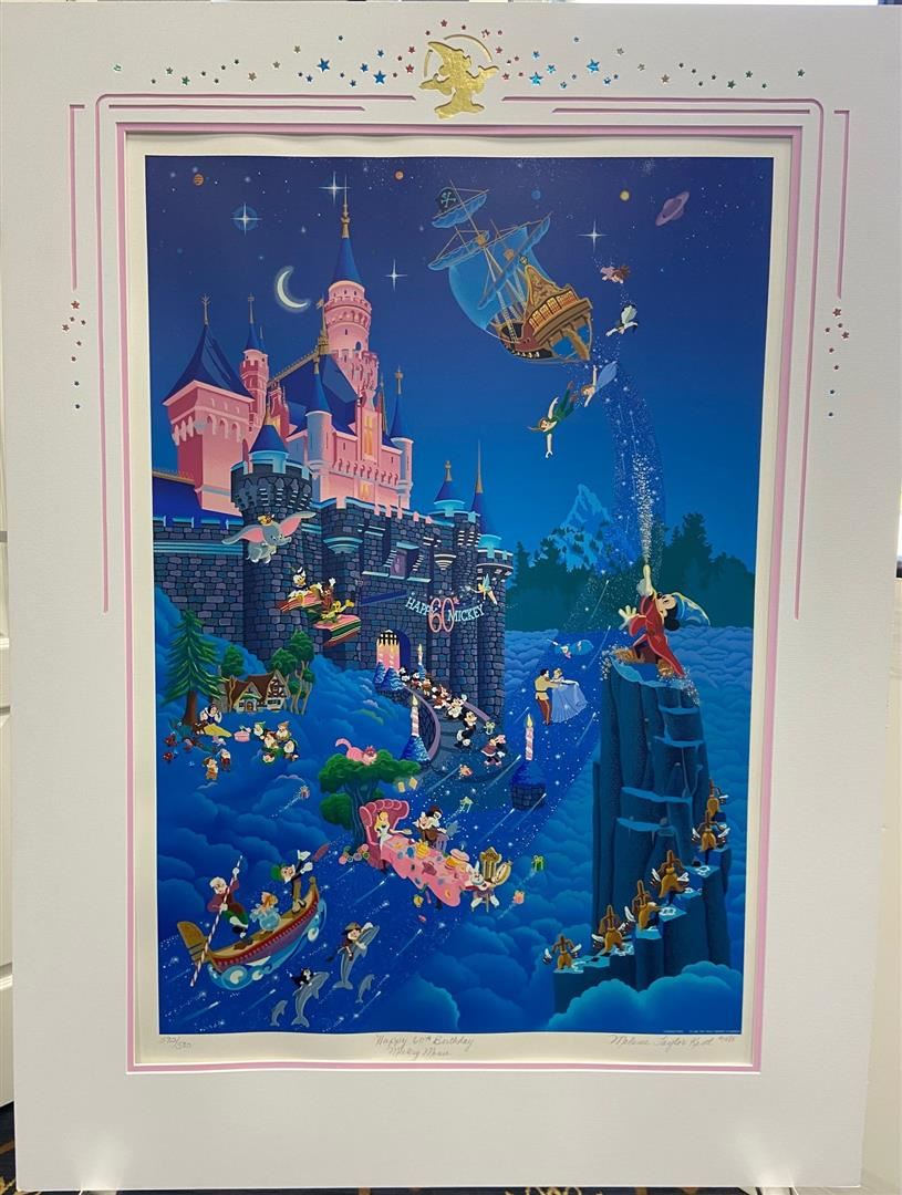 One of the most successful artists of the animation movement, Melanie Taylor Kent's 43x32" matted serigraph Commemorates the 60th Anniversary of Disneyland Matted but not framed.