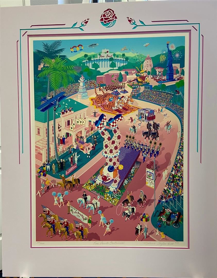 One of the most successful artists of the animation movement, Melanie Taylor Kent's 40x32" matted serigraph Commemorates the 100th Anniversary of the Rose Parade. Matted but not framed.