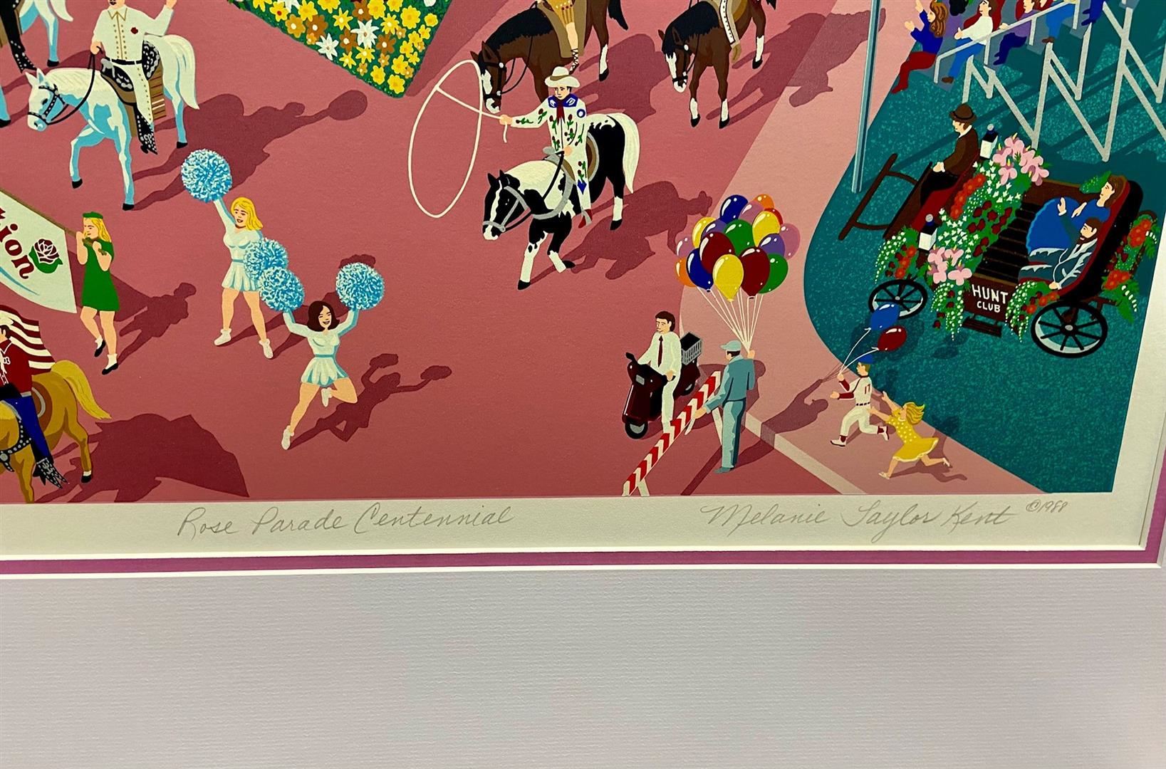 One of the most successful artists of the animation movement, Melanie Taylor Kent's 40x32" matted serigraph Commemorates the 100th Anniversary of the Rose Parade. Matted but not framed.