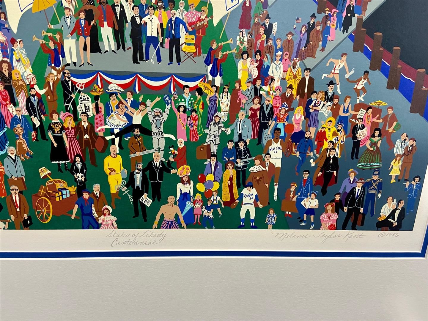 One of the most successful artists of the animation movement, Melanie Taylor Kent's 40x32" matted serigra[ph Commemorates the 100th Anniversary of the Statue of Liberty. Matted but not framed.