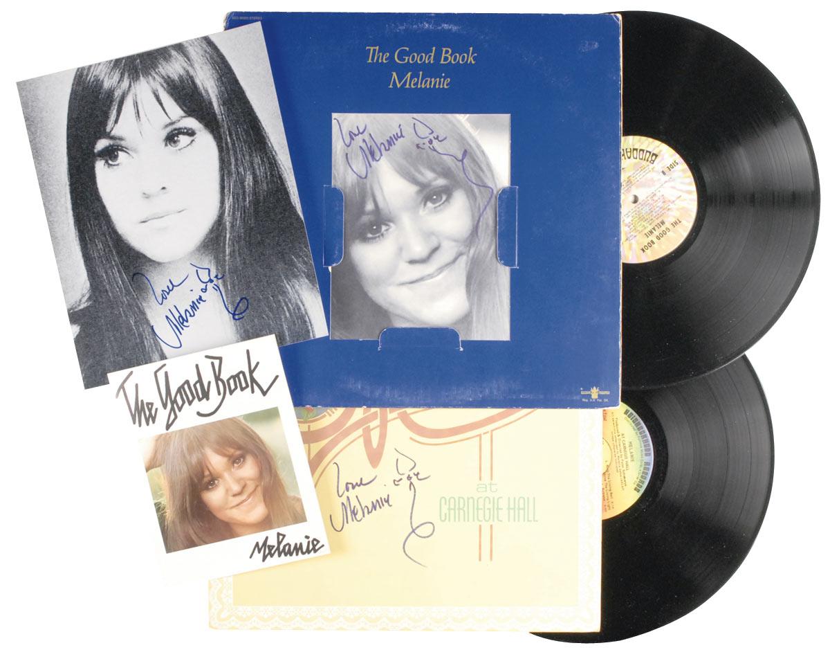 Three items: two albums, The Good Book, and Melanie at Carnegie Hall, each signed on the front cover in blue felt tip, adding a small flower sketch to each cover; and a glossy 8 x 10 head-and-shoulders photo, also signed in blue felt tip with an added flower sketch. In fine condition, with expected wear to album covers. The albums are not included.