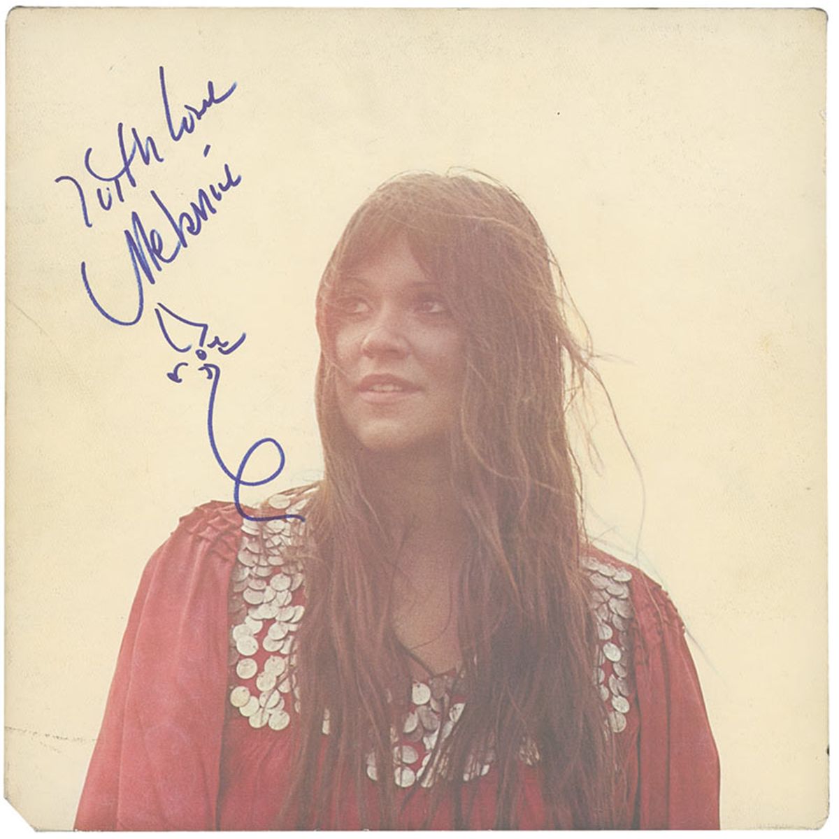 Two signed albums: Leftover Wine and Gather Me, each signed on the front cover in blue felt tip, with Melanie adding a flower sketch to both. In fine condition, with some light wear and soiling to covers. The records are included.