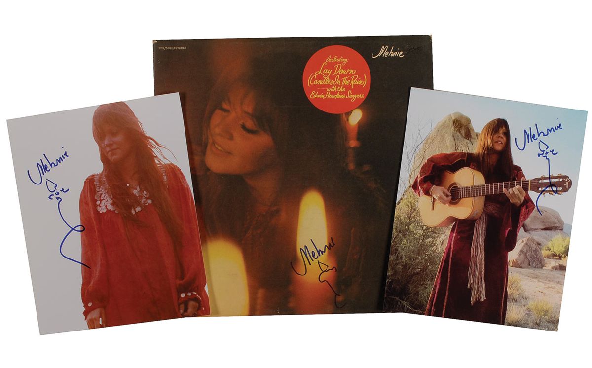 Three items: two color 8 x 10 photos, one glossy and one satin-finish, each signed in blue felt tip; and Candles in the Rain album, signed on the front cover in blue felt tip. The record is included. Melanie has also added a small flower sketch to each of her signatures. In fine condition, with some small separations to edges of album cover.