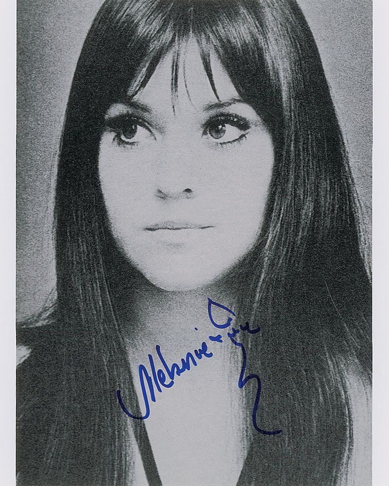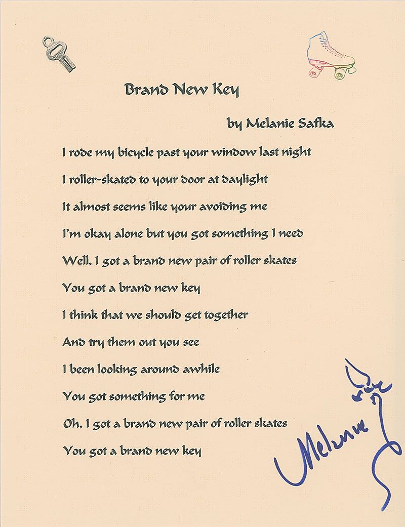 Two items: a pretty glossy 8 x 10 photo of Melanie, signed in blue felt tip; and souvenir printed lyrics to ‘Brand New Key,’ on an off-white 8.5 x 11 cardstock sheet, also signed in blue felt tip, with Melanie adding a small flower sketch next to each signature. In overall very fine condition.