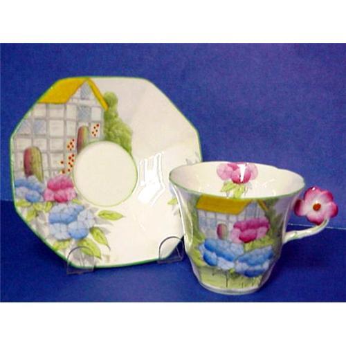 Heirloom hand painted, antique cup & saucer - Made y Melba bone china, guaranteed made in England Reg. number 778351, Titled HYDRANGEA - Both pieces are decorated with gorgeous English cottage surrounded with colorful hydrangeas, Cup is the prize with lovely figural handle in the shape of the hydrangea blossom - Excellent condition - Free of damage - This set is standard size, and made of very fine thin, refined bone china - Please note the shape of the saucer - PLEASE IGNORE the white spot, reflection of the light, on inside the cup.