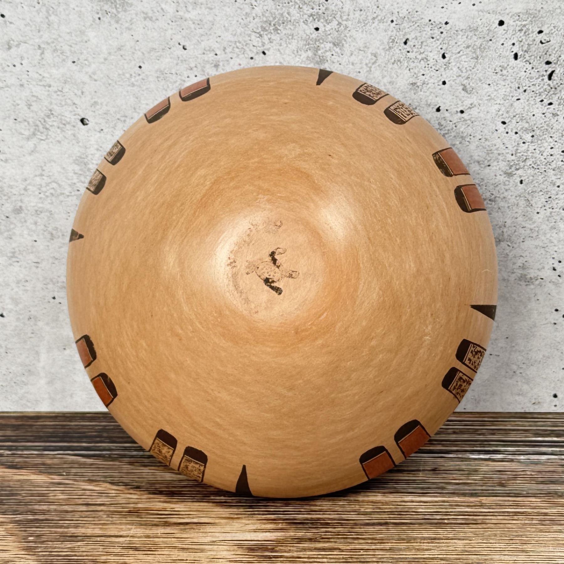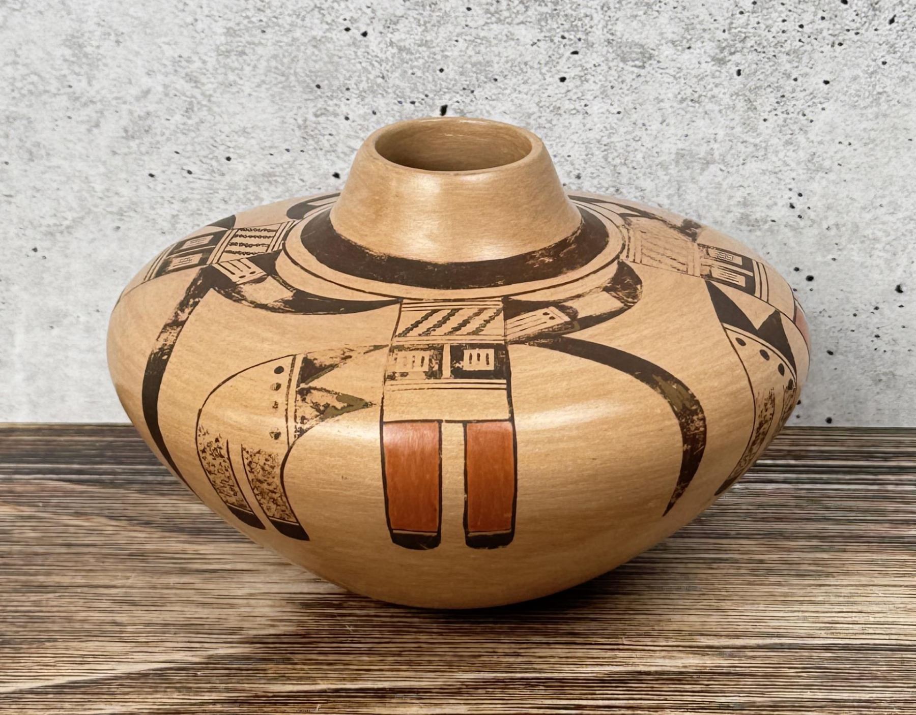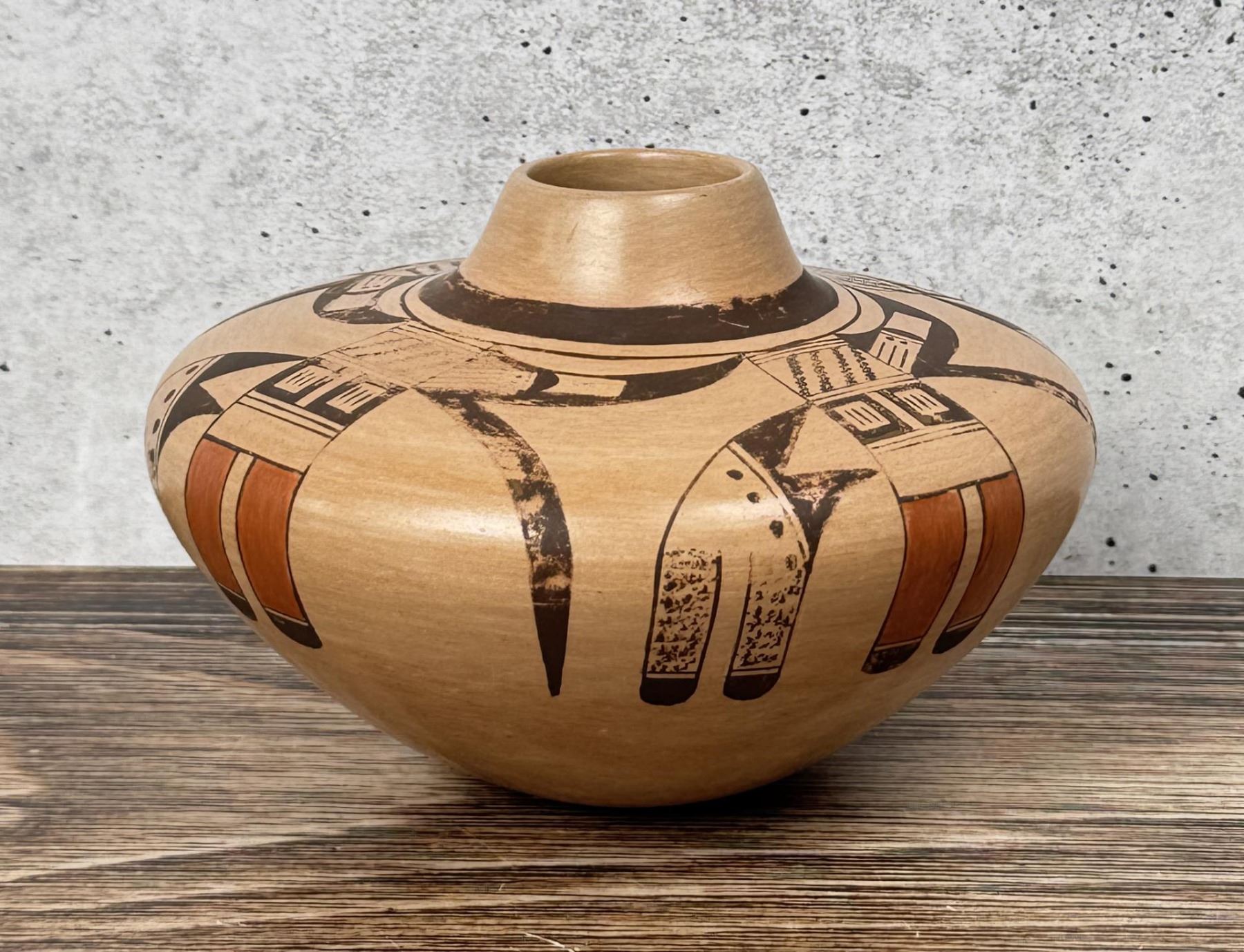 5 1/4" round by 3 3/8" tall. Great Grand Daughter of legendary Fannie Polacca Nampeyo. Fannie Nampeyo (1904 - 1987) was active/lived in Arizona. Fannie Nampeyo is known for Tewa Indian motif pottery vessels. Fannie Nampeyo (Popong Mana, c. 1900-1987) Fannie was Nampeyo's youngest daughter and arguably the most talented potter among her offspring but also the least compatible with her mother. Her life spanned the lion's share of the 20th century, and she remained a prolific artist almost to the time of her death. In addition to emulating her mother's ceramic virtuosity, Fannie inherited Nampeyo's role as matriarch of the Corn Clan—a vitally important and time-consuming ceremonial position. Fannie was rebellious, and bucking tradition and mores, married her cousin, Vinton Polacca, son of Tom Polacca, who was the brother of Nampeyo, Fannie's mother. Instead of adhering to Hopi ways, they raised their seven corn clan children as Mormans, a group who through Tom Polacca made fairly successful inroads at the Hopi Reservation. Fannie began making pottery in her early 20s, teaming up with her mother by painting the pots that the near-blind Nampeyo was still able to expertly form. She continued to assist Nampeyo until the latter's death while building her own reputation as a solo artist. According to biographer Mary Ellen Blair, Fannie signed Nampeyo's name to early collaborative pieces and then switched to "Nampeyo Fan-nie." The signature "Fannie Nampeyo" appears on pots she made alone. Although never an entrant at Indian Market, Fannie did participate in the Museum of Northern Arizona's Hopi Craftsman Exhibition, winning a blue ribbon in 1961. As with many artists, Fannie held other jobs and interests throughout her life. She started out as a teen working for Hopi House in the housekeeping department. A tamale business made her famous in the environs of Keams Canyon. She became a devout Mormon and devoted much time to religious affairs as well as to learning Mormon crafts such as quilting. In addition, she inspired and taught all of her children—daughters Elva, Tonita, Iris, and Leah as well as sons Harold, Ellsworth, and Tom—to continue the Nampeyo legacy of pottery making.