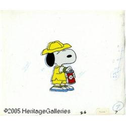 <B>Melendez Productions - Snoopy Hand Painted Production Cel Original Art (undated).</B></I> Snoopy pops the top on a can of tennis balls, in this original, hand-painted animation cel. In 1964, Bill Melendez produced the first Schulz television special, "A Charlie Brown Christmas," and has been the exclusive animator of Schulz characters ever since, a relationship that has continued to receive critical notice as <I>Peanuts</B></I> became the longest running series of specials in television history. This celluloid measures 10.5" x 12.5" and is presented here, together with the matching original production animation drawing in graphite pencil.