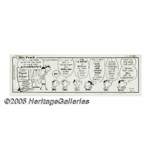 <B>Mell Lazarus - Miss Peach Daily Comic Strip Original Art, dated 3-23-57 (New York Herald Tribune, 1957).</B></I> America's favorite schoolmarm and her classroom rascals fill this early daily from 1957. Dated just over a month from the strip's first publication, this charming single-panel strip has an image area of 17.5"" x 5"". Signed and inscribed ""To Jerry, with all good wishes, Mel Lazarus,"" along the lower edge. <BR><BR><B>Important notice:</B> Heritage usually auctions material at the rate of 200-250 lots per hour. On some occasions eBay Live bid software or the Internet may not be able to keep up with the pace of the auction. We recommend placing a realistic absentee bid now as insurance to avoid disappointment. Occasionally the auctioneer may eliminate or reject an eBay Live bid, and the auctioneer may also reopen a lot after the close of the eBay live bidding (usually because we missed an audience bid), and may reject your bid even if it shows you as the winning bidder. By bidding via eBay Live, you agree that Heritage may award the lot to another bidder at its sole discretion under the circumstances described above or any other reasonable circumstances. Since eBay bids are not shown to us until we open the lot on the floor, we treat those bids just like floor bids. In most cases the floor responds before the eBay bid is presented to us, due to Internet lag time, so for consistency we have made it a policy that floor bids are always considered first over tie eBay live bids. Also please note that all Heritage lots purchased through eBay Live carry a 20% Buyer's Premium. Please make sure you read the Terms and Conditions before you bid. This lot is being auctioned in conjunction with a live floor auction by Heritage Galleries & Auctioneers. All final auction and invoice information will be supplied by Heritage Galleries & Auctioneers, and all other information should be considered preliminary. Lot:4294 <BR><BR><B>Winning Notification and Billing:</B> Afte