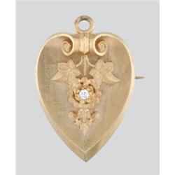 Prága, 19. sz. vége, 18 k arany, "MG" mesterjegy, pajzs formán leveles rátéten 1 db briliáns, cca 0,10 ct, R1TCrVs, fényképleszorító üveg hiányzik, 9,4 g
