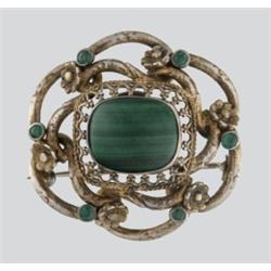 Budapest, 1940 körül, aranyozott ezüst, "BR" mesterjegy, karéjos keretben 1 db cabouchon malachit kovel, 6 db zöld üvegkovel, 11,3 g