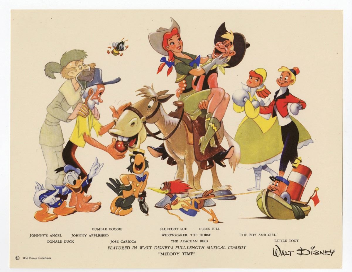 (Walt Disney Studio, 1948) A charming illustrated fan card featuring the characters from the feature film, "Melody Time". Measures 7.25"x9.25". In very fine condition.