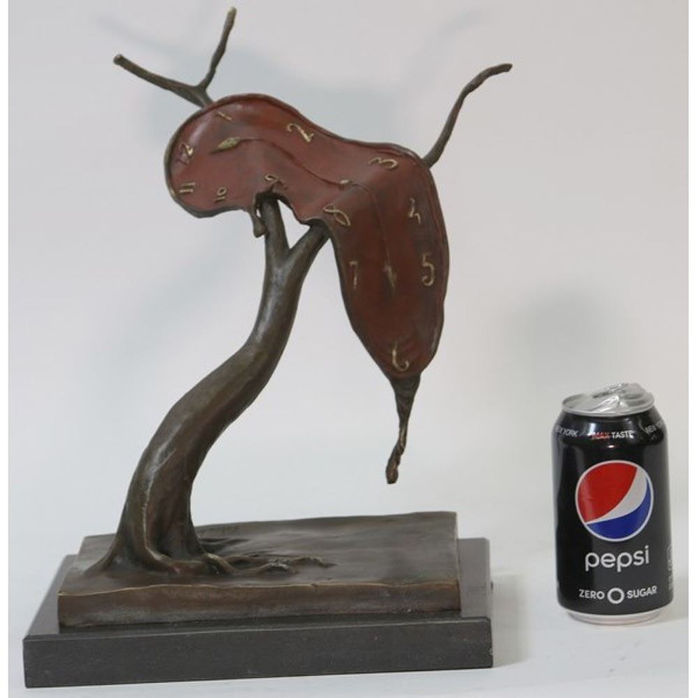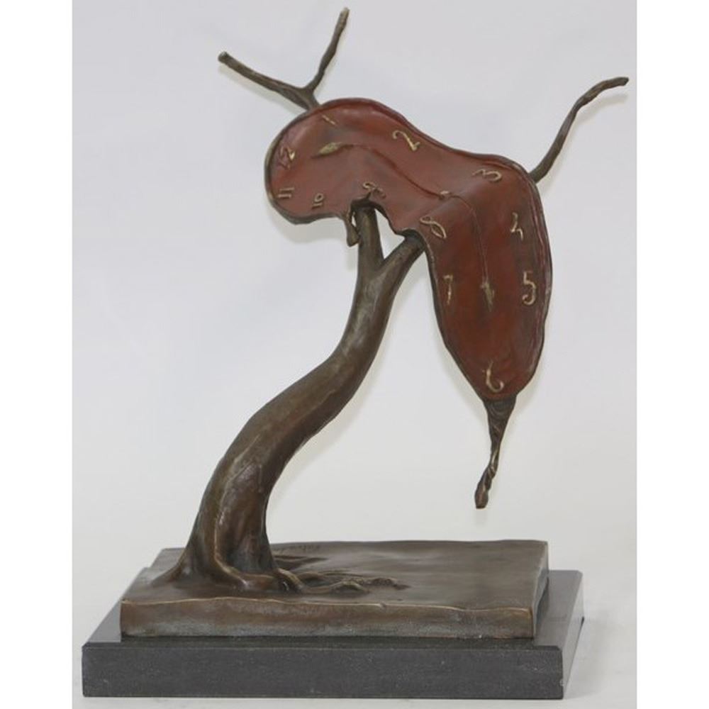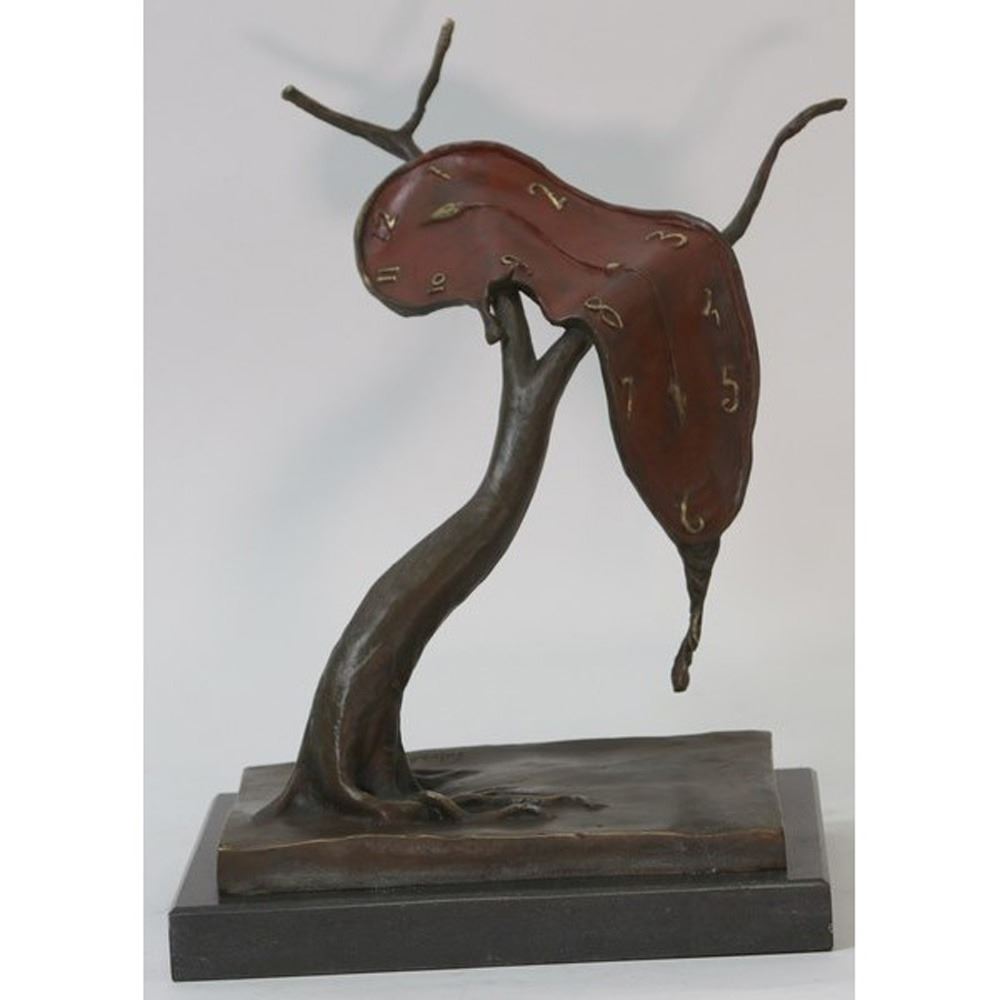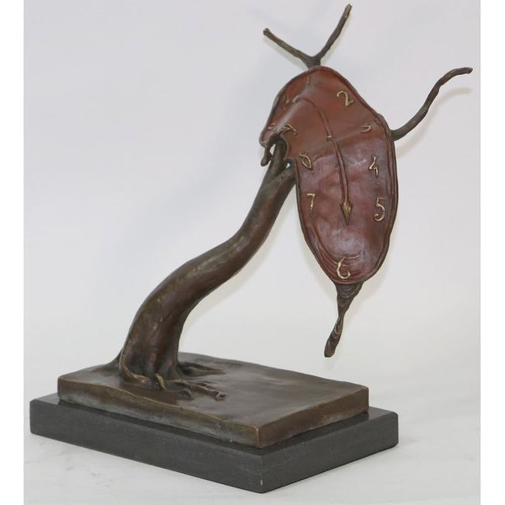 With this sculpture, It is an uncomplicated form composed of a melting watch draped over the branch of a tree. The materialization of the flexibility of time and the indivisibility of time and space. Time is not rigid. It is one with space - fluid. This sculptural examines the human perception of time when we are involved in enjoyable activities or in work that absorbs all our attention, time flies, but when we are mired in boredom, time drags. The flaccid watch no longer keeps the time it does not quantify its passage. Accordingly, the speed of our time depends only on us. This sculpture was cast using the Lost Wax Method and it is mounted on a marble base. Dimensions: Height 13 X Width 11 inches. Weight: 14 LBS.