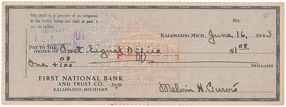 FBI agent and archetypical “G-Man” (1903–1960) responsible for the capture of John Dillinger, ‘Pretty Boy’ Floyd, ‘Baby Face’ Nelson, and other notorious baddies. Bank check, 8.25 x 3, filled out and signed by Purvis, “Melvin H. Purvis,” payable to Post Signal Office for $1.08, June 16, 1943. Check is stamped near the top, “This check is payment of an obligation to the United States and must be paid at par, no protest.” In fine condition, with expected stamps and cancellation holes.