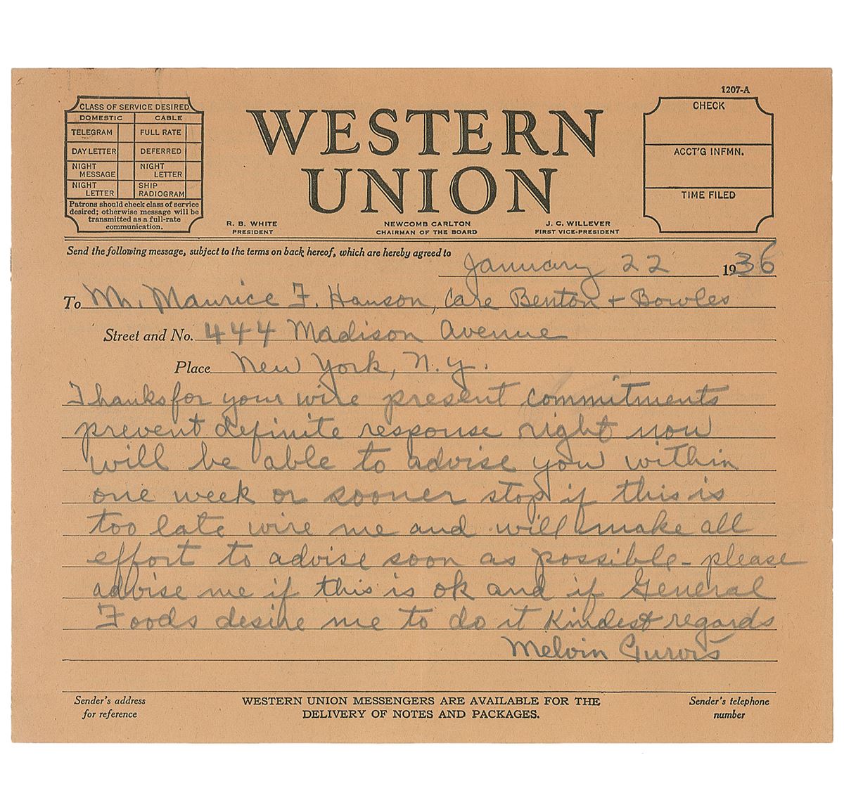Handwritten telegram in pencil, one page, 8.5 x 7, Western Union letterhead, January 22, 1936. A telegram to Maurice Hanson in New York. In part: “Will be able to advise you within one week or sooner stop if this is too late wire me and will make all effort to advise soon as possible.” In fine condition, with uniform toning and a few small edge tears. Accompanied by a bank check filled out and signed by his wife, Rosanne Willcox Purvis.