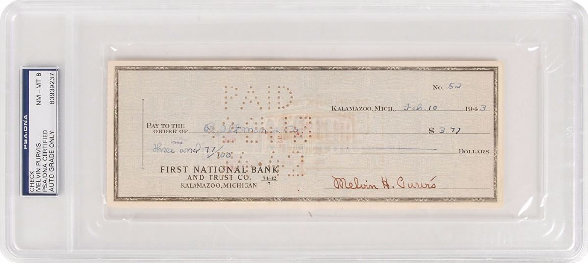 FBI agent and archetypal ‘G-Man’ (1903–1960) responsible for the capture of John Dillinger, ‘Pretty Boy’ Floyd, ‘Baby Face’ Nelson, and other notorious gangsters. Bank check, 8.25 x 3, filled out in another hand and signed by Purvis, "Melvin H. Purvis," payable to B. Altman & Co. for $3.77, February 10, 1943. Encapsulated in a plastic PSA/DNA authentication and grading holder, evaluating the signature as "NM-MT 8." In fine condition.
