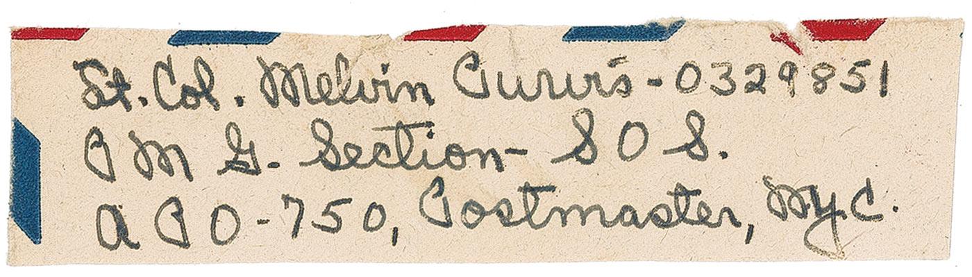 Fountain pen signature, “Lt. Col. Melvin Purvis - 032981, P M G Section - S O S., A P O - 70, Postmaster, NYC,” on an off-white 3.75 x 1 slip cut from a return address. In very good condition, with uniform toning and small tears (one passing through his name) repaired on the back with old tape.