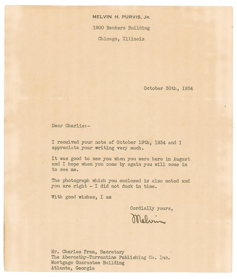 FBI agent and archetypical “G-Man” (1903–1960) responsible for the capture of John Dillinger, “Pretty Boy” Floyd, “Baby Face” Nelson, and other notorious baddies. TLS signed “Melvin,” one page, 7 x 8.25, personal letterhead, October 30, 1934. Letter to Charles Fram at Abernethy-Turrentine Publishing Company. In part: “It was good to see you when you were here in August and I hope when you come by again you will come in to see me. The photograph which you enclosed is also noted and you are right-O I did not duck in time.” In very good condition, with trimmed edges, horizontal mailing fold through signature, and scattered toning.