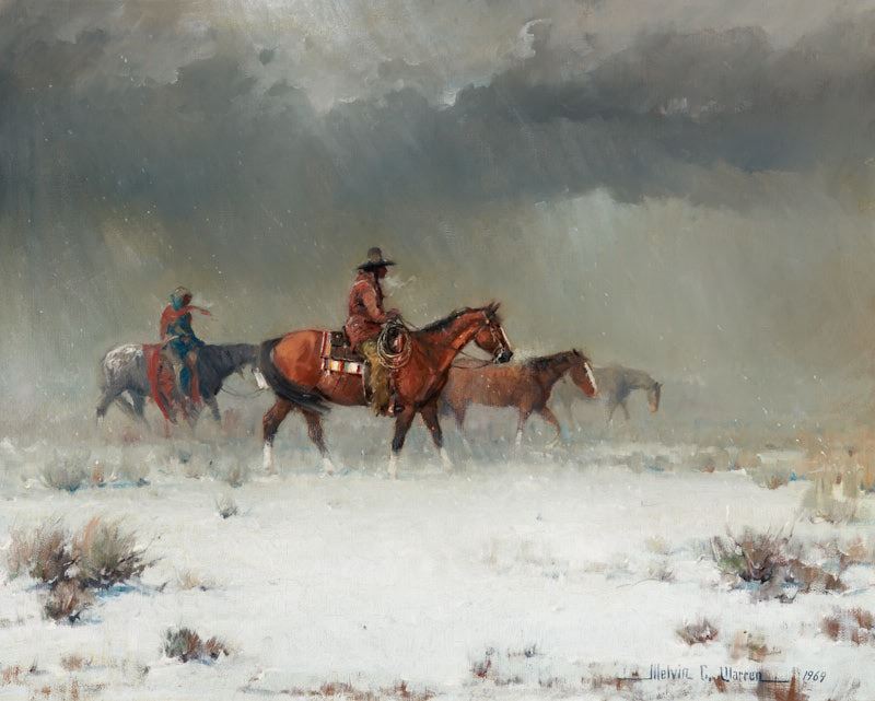 To the unaided eye, this piece appears to be in excellent condition. Inspection under ultraviolet light reveals a normal fluorescence of the artist's pigments. There are no signs of damage or restoration. The piece is framed in an ornate pale antiqued gold frame with a pale antiqued gold liner. The frame is in very good condition with slight separation in the corners. Plate: "Snow Storm" Melvin C. Warren Verso: [label affixed to backing] Country Store Gallery, Austin, TX