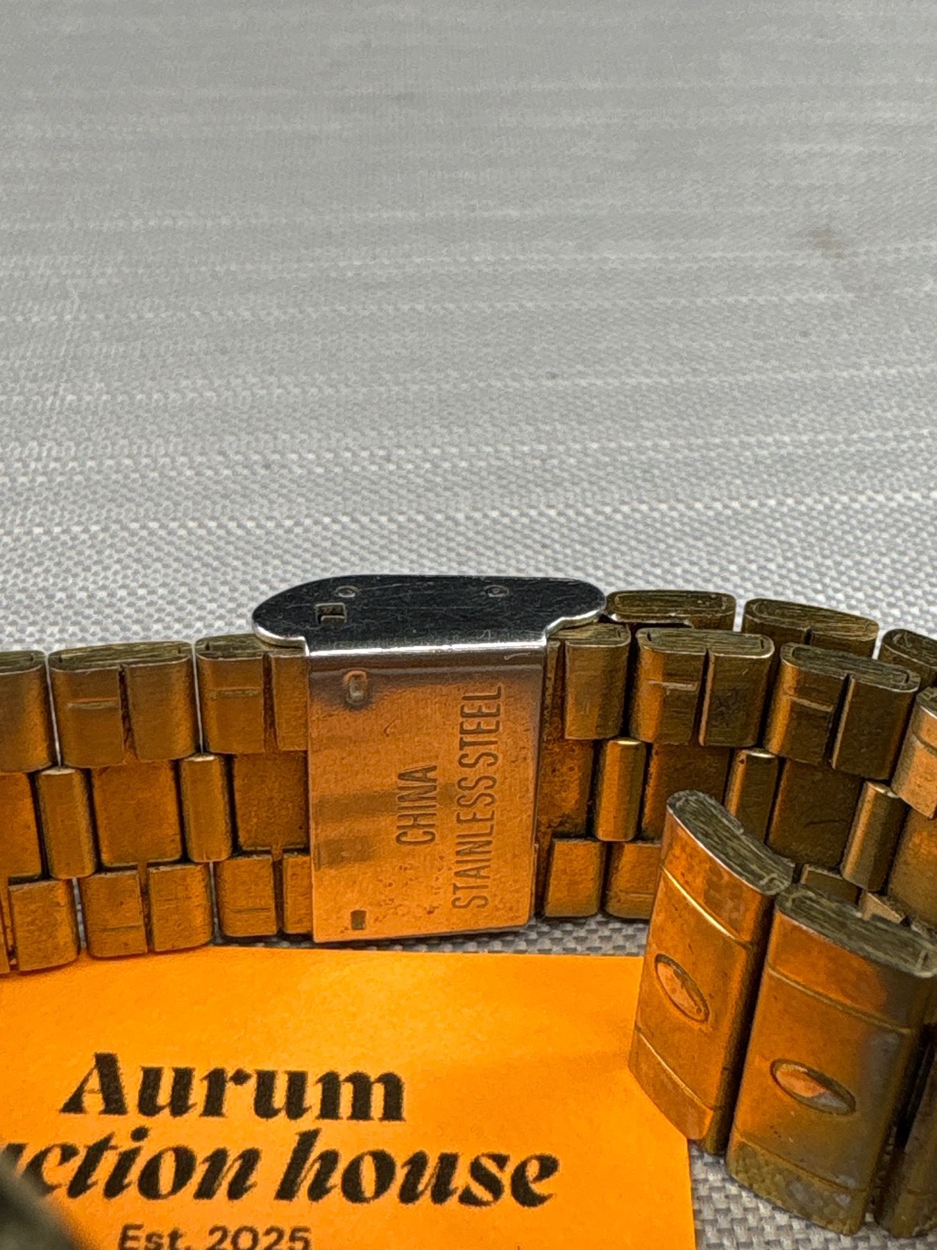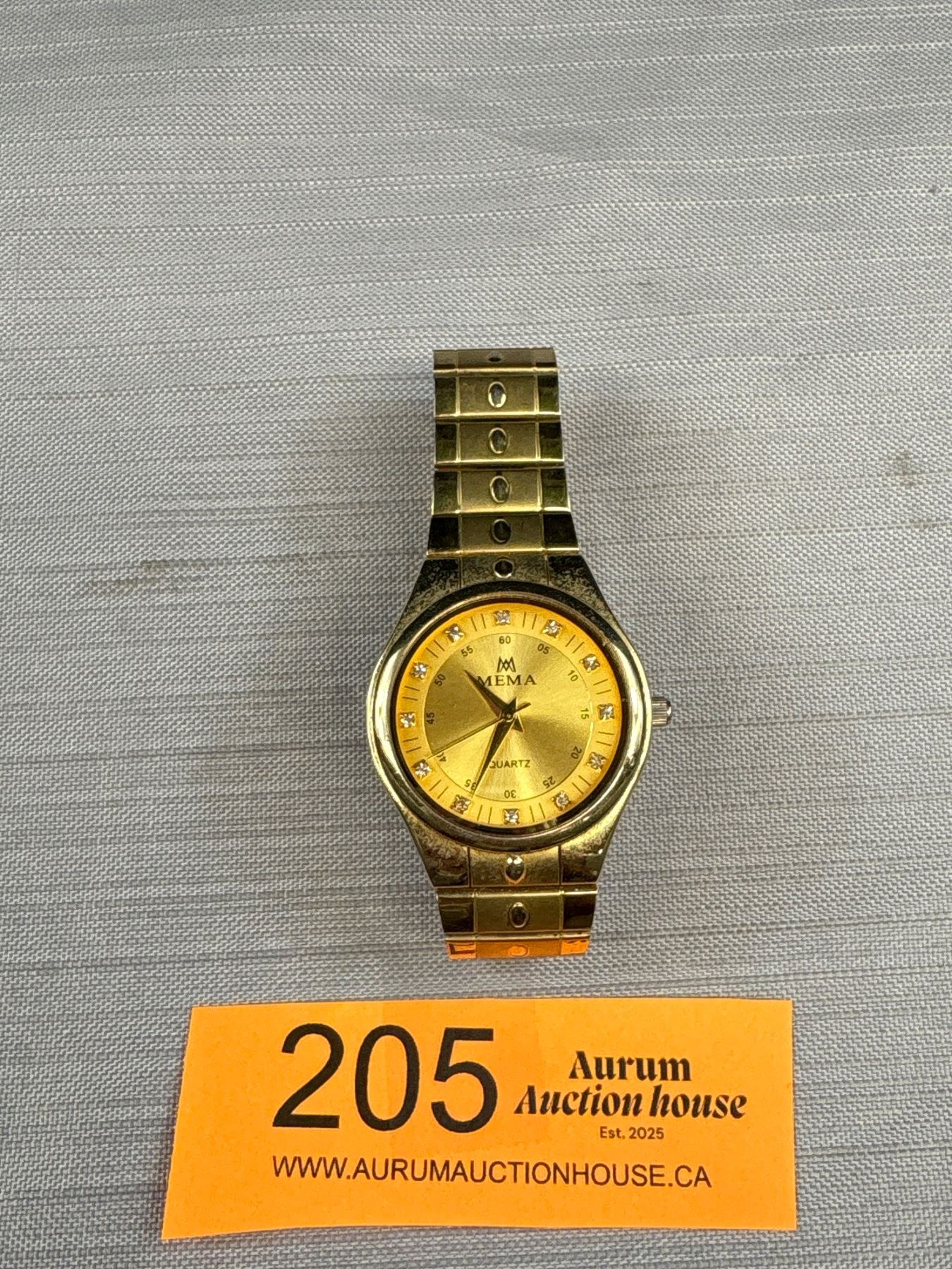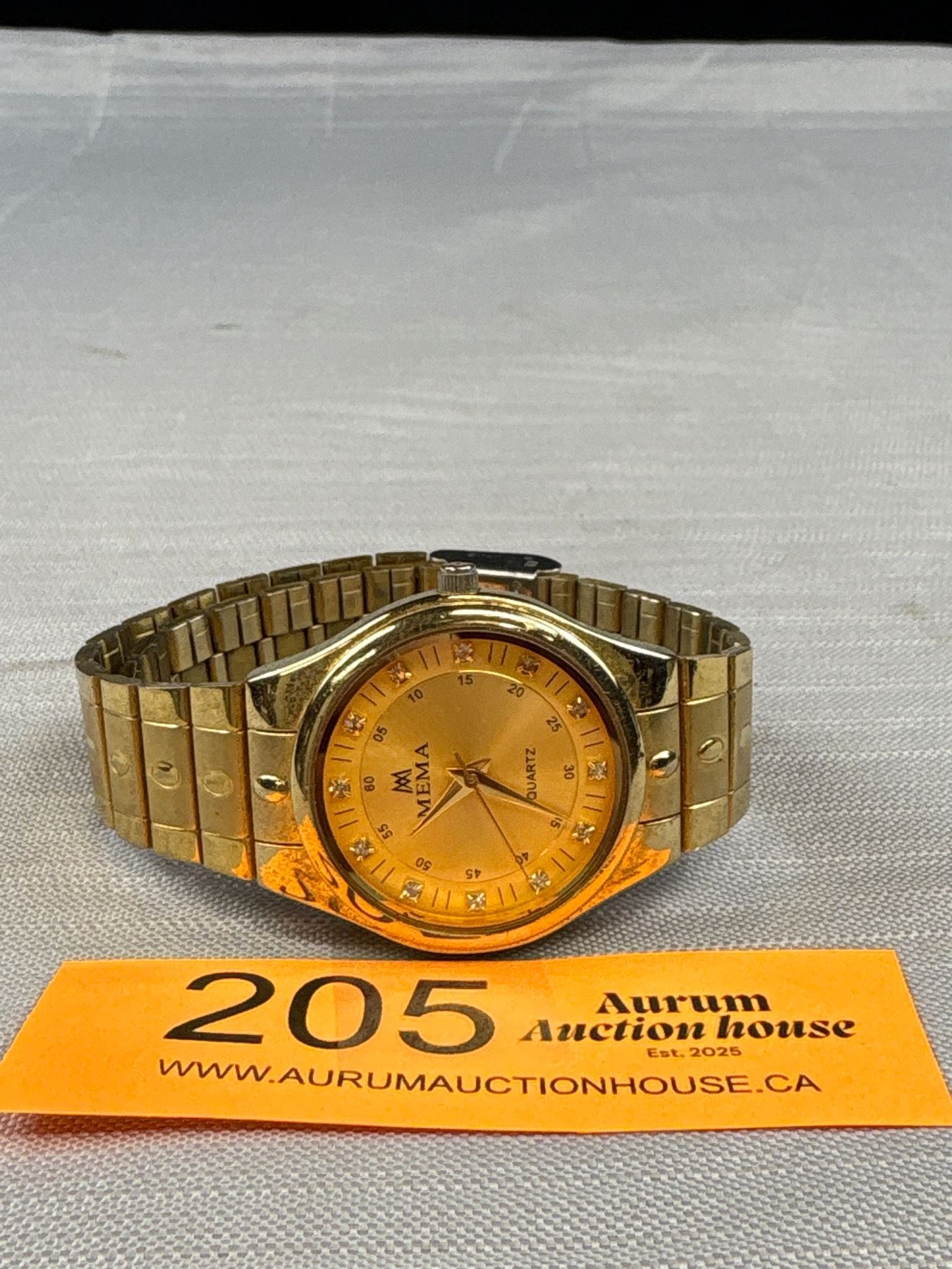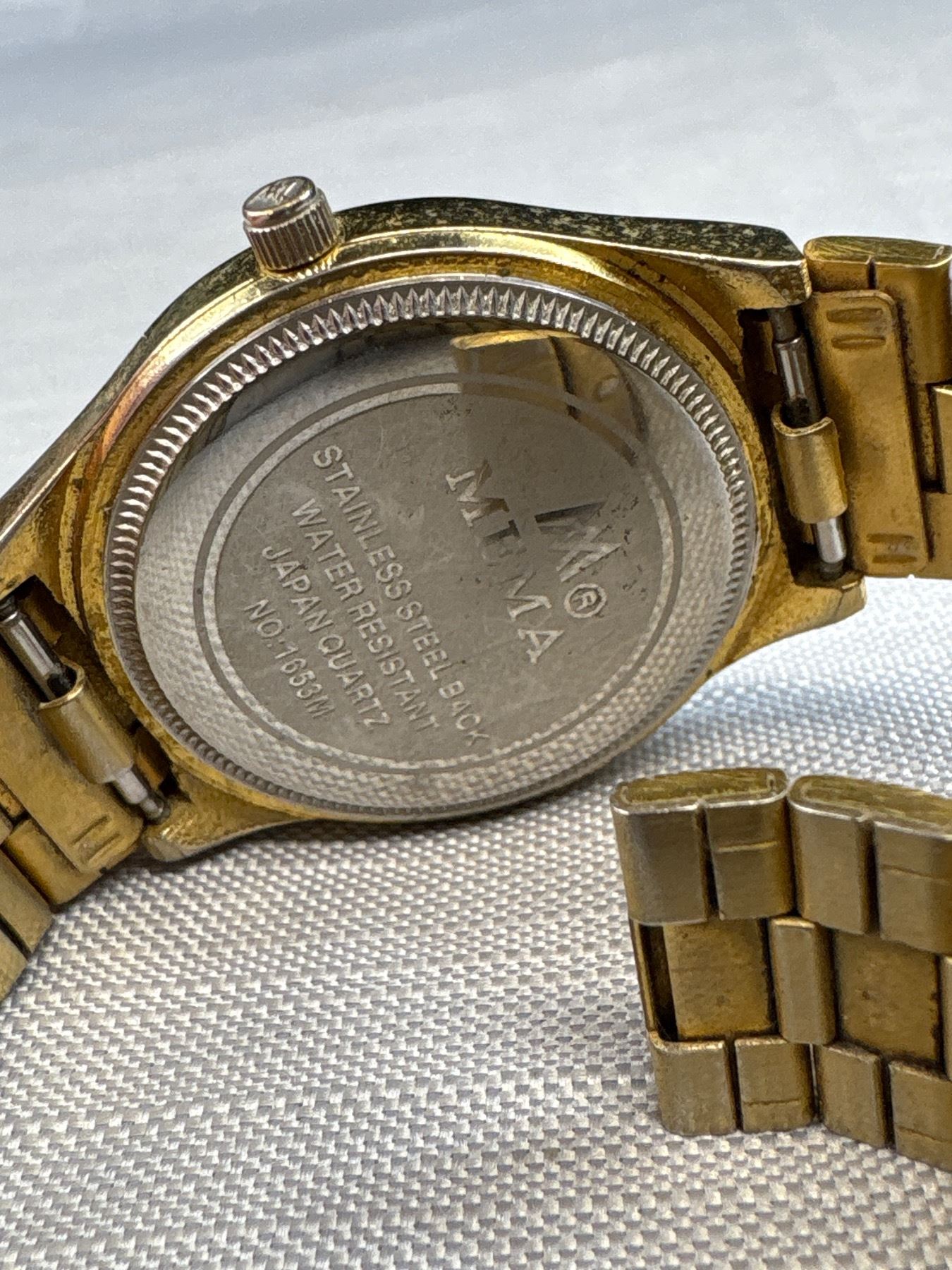 Mema Quartz Wrist Watch 60 Minutes Dial Stainless Steel Back, Japan, No. 1653 M Battery Required