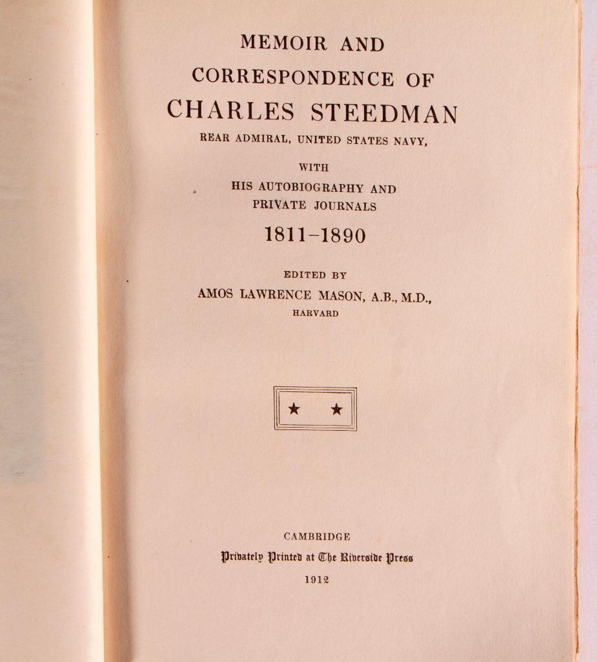 Title: Memoir and Correspondence of Charles Steedman Rear Admiral, United States Navy with his Autobiography and Private Journals 1811-1890 Author: Edited by Amos Lawrence Mason Published: The Riverside Press, Cambridge, 1912 Description: Hardcover. Condition: Good condition.