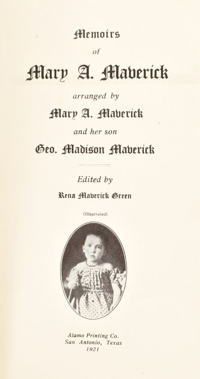 San Antonio's First American Woman . Arranged by Mary A. Maverick and her Son Geo Madison Maverick. Alamo Printing Co. 1921