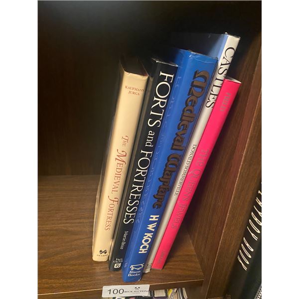 Includes an assortment of books about the Medieval era, castles, fort/fortresses, and an illustrated book of Queen Elizabeth