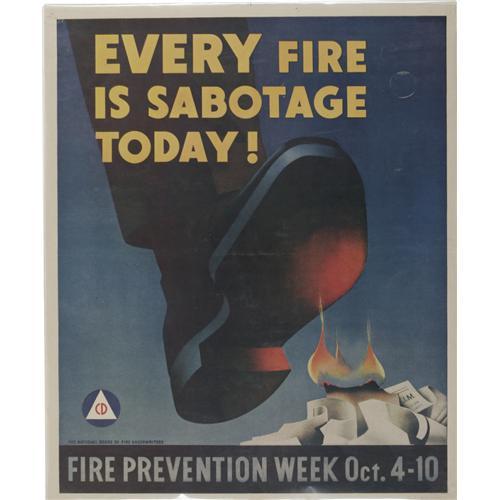 <B>"Every Fire Is Sabotage Today" Propaganda Poster.</B></I> Bold graphics and eye-catching colors make this vintage fire prevention poster a terrific display piece for any fire-fighter's wall! This poster has an approximate overall size of 19" x 23.5", and it is in Excellent condition.<BR><BR><b>Shipping:</b> Flat Material, Large (<a target="_blank" href="http://www.heritageauctions.com/common/shipping.php">view shipping information</a>)