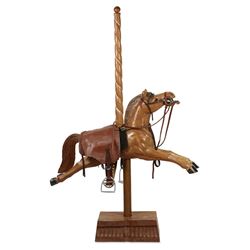 Circa 1950. Carnival art. Hand carved. Outfitted with leather saddle and accessories. Secured with matching carved base, copper pole. 49” x 45” x 12”.