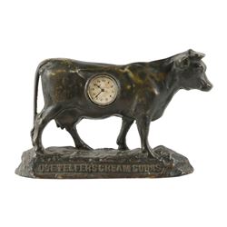 Bronzed cast iron composition with inset clock. Figural cow clock embossed "Use Telfer's Cream Sodas", base. 13" x 9" x 2&qu...