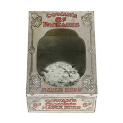 Canadian. Circa 1920s. Embossed "Cowan's Chocolate Maple Buds 5c". Glass lid allows for view of contents. Lithographed side panels. 10...
