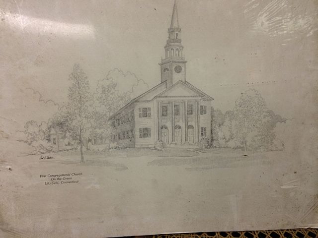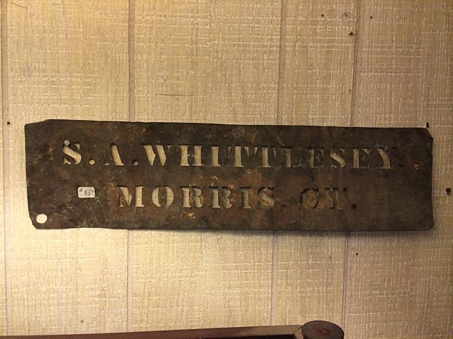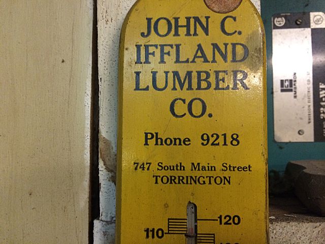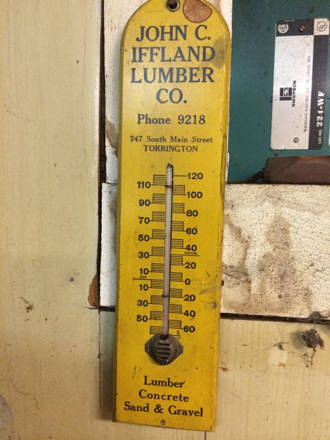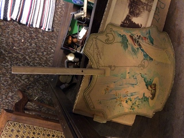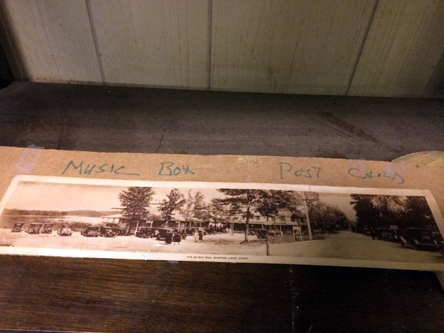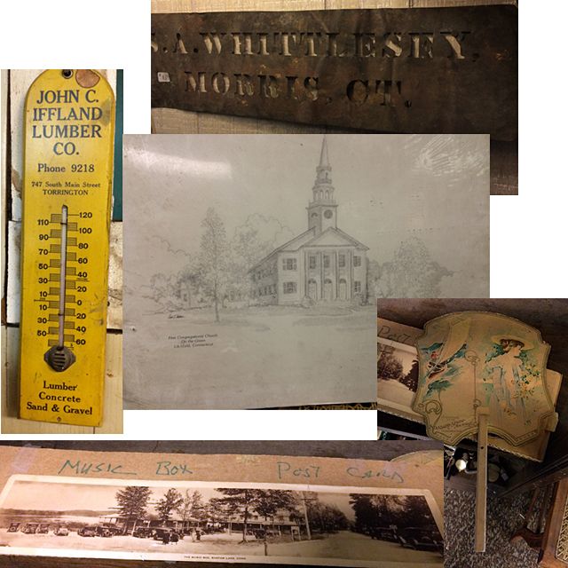 Over Sized post card from the original "Music Box" at Bantam Lake, CT (former site of the more recent Beverly's). Early metal stencil for Whittlesey, promotional ladies Victorian Hand Fan by Singer Sewing, very early Iffland Lumber wall Thermomater and print of Litchfield Congregational Church. These items may be picked up in Torrington, CT. Appointment time will be scheduled after auction date.