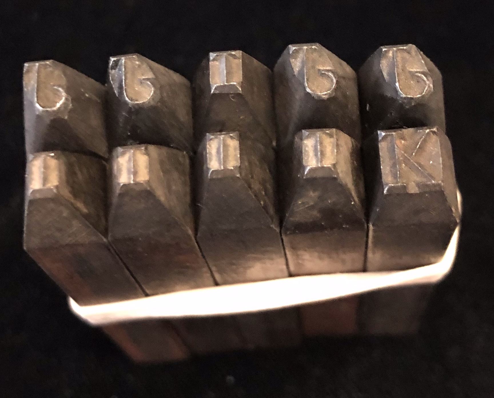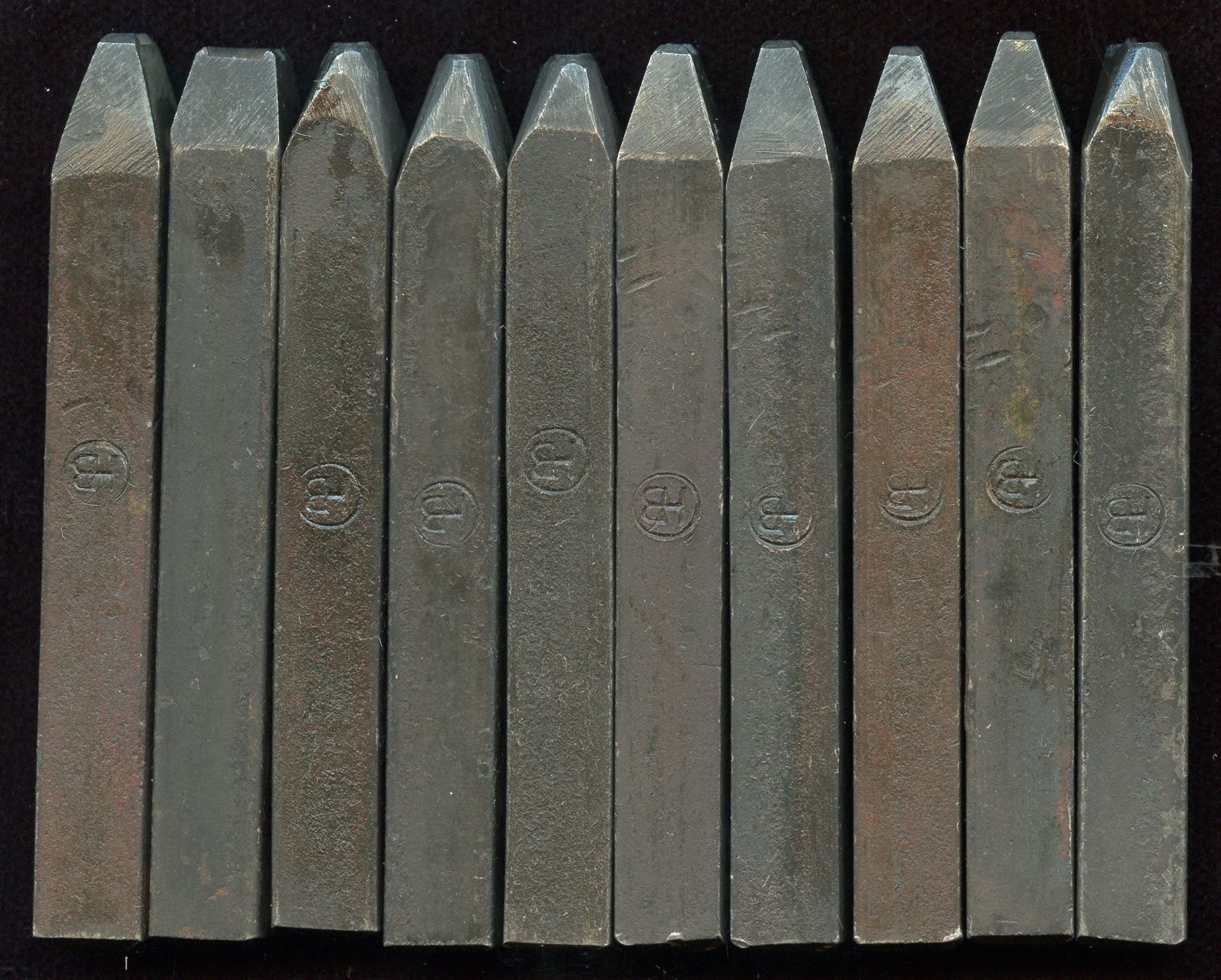 Ten steel letter punches with all marked with "HB" within a circle on the shaft of the punches. We have never seen these previously.