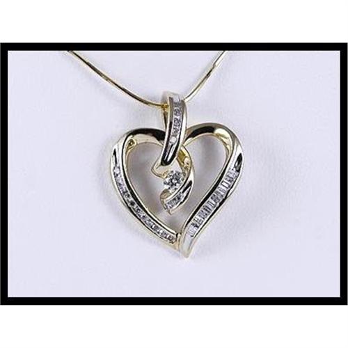 Memorable heart shaped pendant with 20 full cut diamonds that weigh 0.25 carats and 12 tapered baguette diamonds that weigh 0.20 carats set in 14K yellow gold. The pendant measures 25.8 millimeters (1.02 inches) x 20.8 millimeters (0.82 inches) and weighs 3.20 grams total weight.