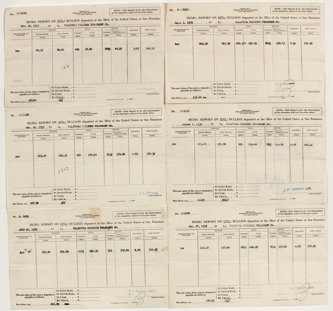 Lot of six memorandums of deposit for gold and silver bullions at. Talapoosa was small mining community that was worked at early as 1864 according to some sources. Consensus is that most of the mining took place in Talapoosa between 1911 and 1943. Talapoosa is located around 3 miles north of Silver Springs, NV. Originally it was prospected by Virginia City, NV miners. The mines mainly extracted gold, silver and copper. According to Bertrand Franklin Couch and Jay A. Carpenter, Talapoosa had some of the lowest years of production in 1914 and 1940 when extracted an estimated $12,400. Shortly following the Great Depression, around the time these memorandums were submitted, Talapoosa was able to extract around $304,151. These particular submissions of bullions were from the reworking of tailings. All date between July and November of 1939. Each is stamped by Superintendent PJ Haggerty. The bullions were assayed at being worth between $100 and $375. All were originally folded either in half. All are in good or very good condition. - HKA#65713