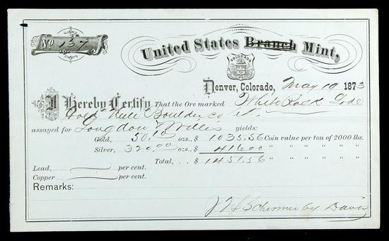 Memorandum of Gold and Silver- J. Schirmer by Davis. 50.10 oz. of gold totalling 1,035.56 and 320 oz. of silver totalling $416, coming to $1451.56 and deposited at the U.S. Mint, Denver, Colorado, May 19, 1873.