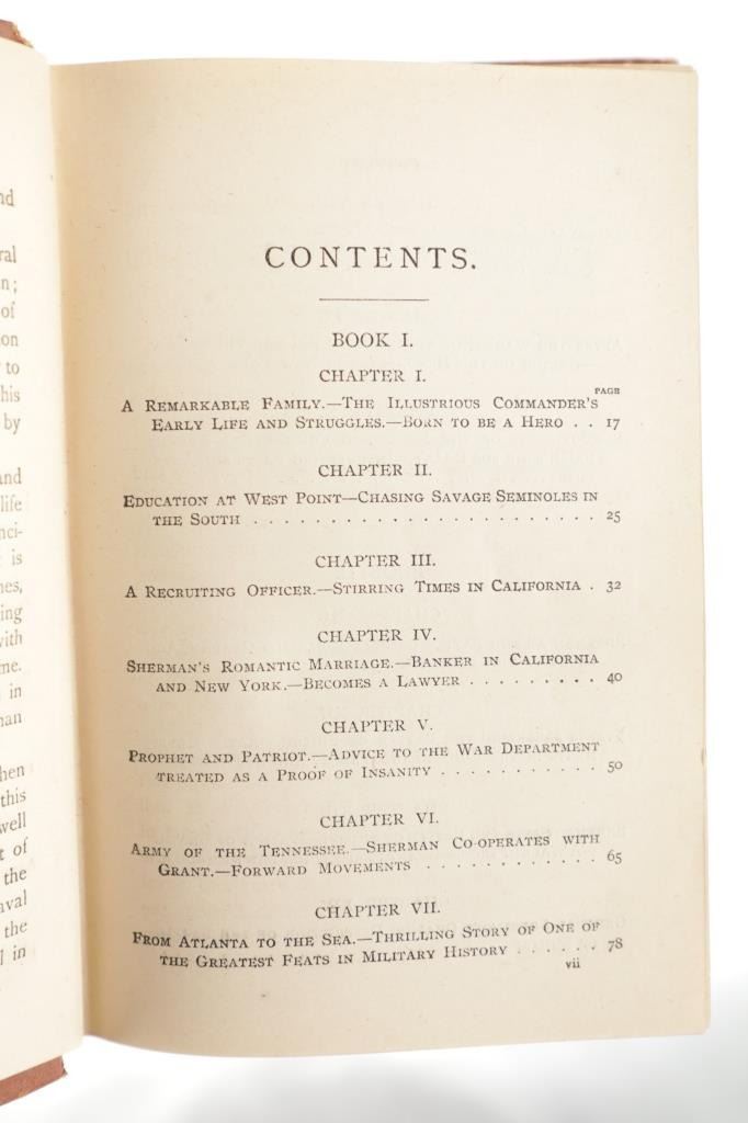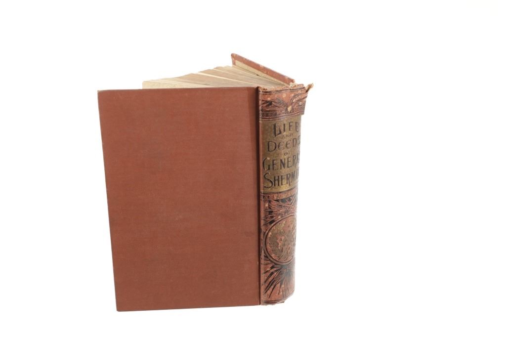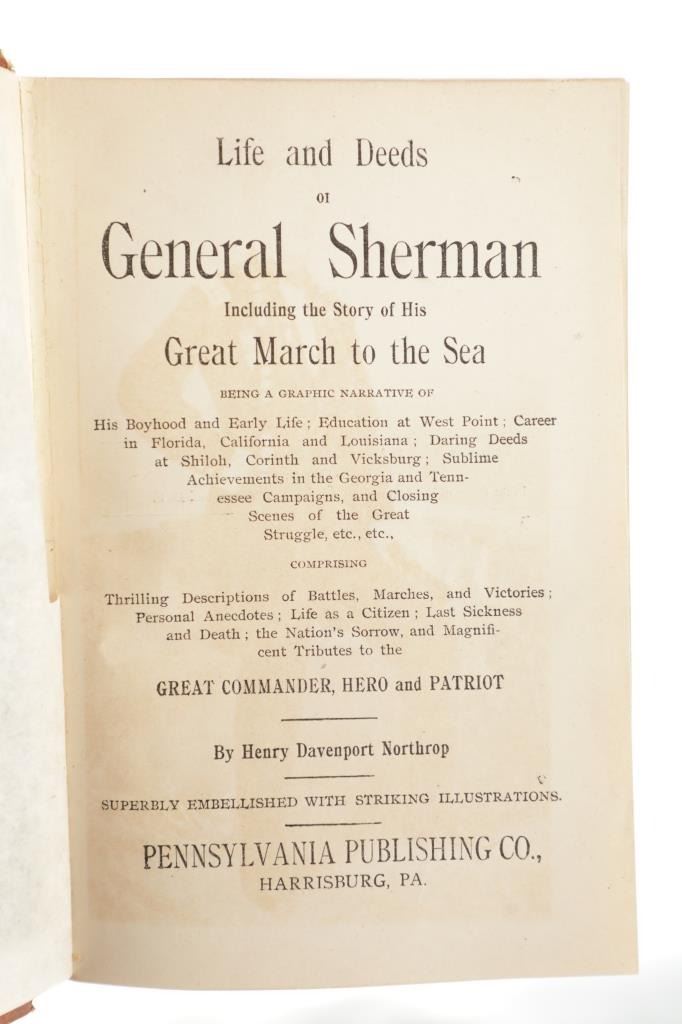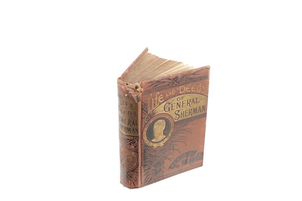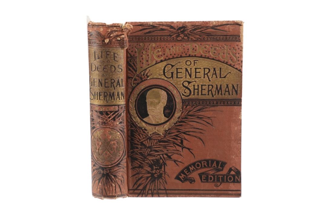 Included in this lot is the Rare First Edition Post-Civil War book about the life of General William Tecumseh Sherman, the Memorial Edition of "Life and Deeds of General Sherman", by Henry Davenport Northrop, 1891. "Life and Deeds of General Sherman" is a tribute to General William Tecumseh Sherman. His early life is described as well as his days at West Point and his early career in Florida, California, and Louisiana, daring deeds at Shiloh, Corinth, and Vicksburg, sublime achievements in the Georgia and Tennessee campaigns, and closing scenes of the great struggle, etc. The story of a great commander, hero and patriot, detailed account of Sherman’s Civil War exploits including his infamous March To The Sea, with engraved portrait frontispiece and numerous illustrations and maps. This brown clothbound gold gilt stamped hardcover is in good overall condition. Most of the gold gilt stamped illustrations on the front cover and spine is still bright. The spine has a crack located at the top edge with the front cover, scuffing noted to cover edges. Intact pages have fore-edge decorative painting, age tanning and foxing exhibited, no other obvious marring noted. Measures 5.25"W x 8.25"L x 1.25"D approximately.