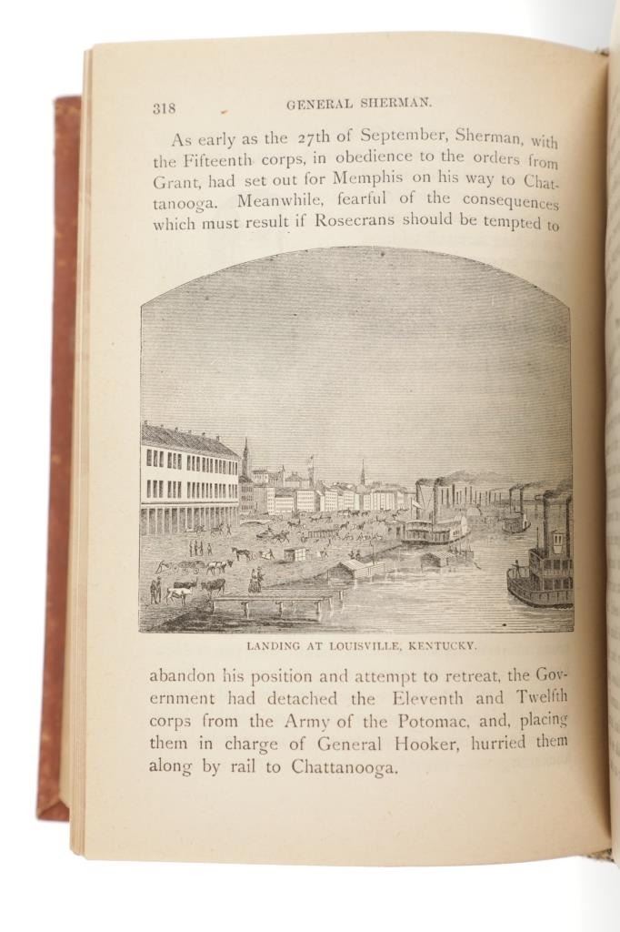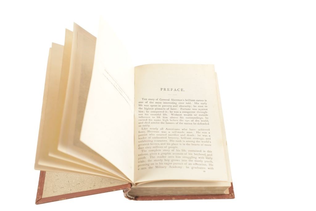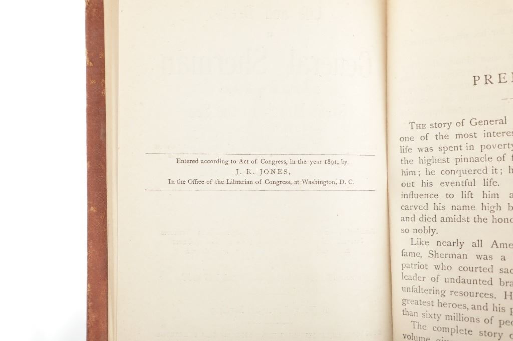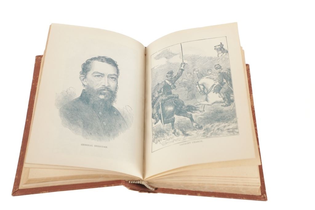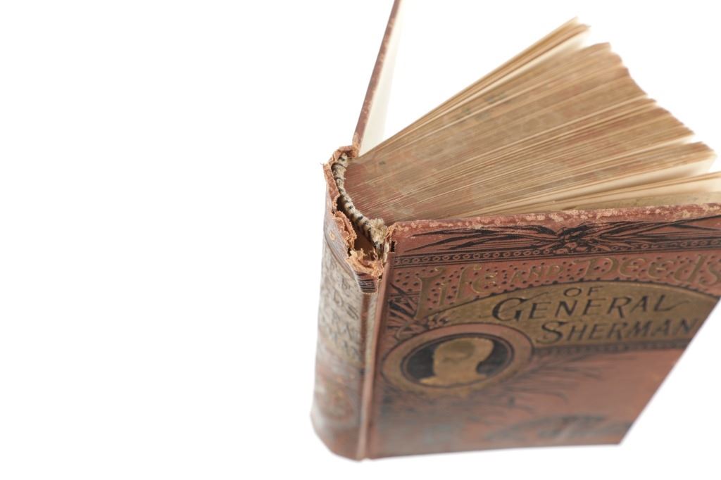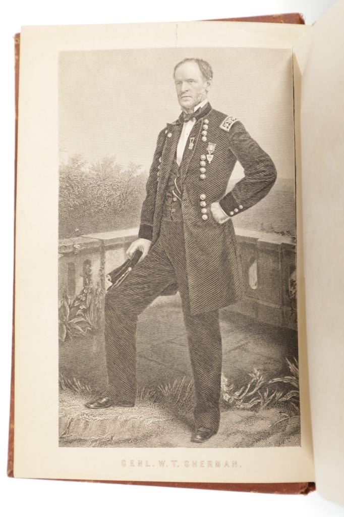 Included in this lot is the Rare First Edition Post-Civil War book about the life of General William Tecumseh Sherman, the Memorial Edition of "Life and Deeds of General Sherman", by Henry Davenport Northrop, 1891. "Life and Deeds of General Sherman" is a tribute to General William Tecumseh Sherman. His early life is described as well as his days at West Point and his early career in Florida, California, and Louisiana, daring deeds at Shiloh, Corinth, and Vicksburg, sublime achievements in the Georgia and Tennessee campaigns, and closing scenes of the great struggle, etc. The story of a great commander, hero and patriot, detailed account of Sherman’s Civil War exploits including his infamous March To The Sea, with engraved portrait frontispiece and numerous illustrations and maps. This brown clothbound gold gilt stamped hardcover is in good overall condition. Most of the gold gilt stamped illustrations on the front cover and spine is still bright. The spine has a crack located at the top edge with the front cover, scuffing noted to cover edges. Intact pages have fore-edge decorative painting, age tanning and foxing exhibited, no other obvious marring noted. Measures 5.25"W x 8.25"L x 1.25"D approximately.