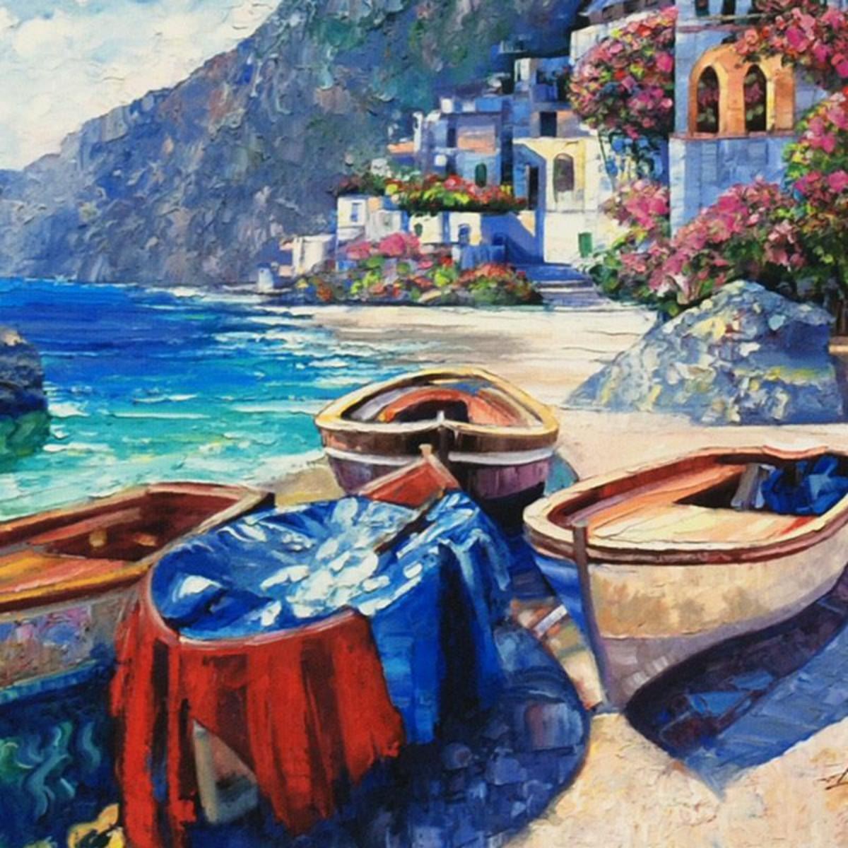 With bright colors and lush textures, Howard Behrens' artwork adds a tropical and exotic feel to any art collection. "Memories of Capri" is a limited edition hand embellished giclee on canvas. Numbered and hand signed by the artist. Includes Certificate of Authenticity! Measures approx. 12" x 9"(image). Reference #: 179388.