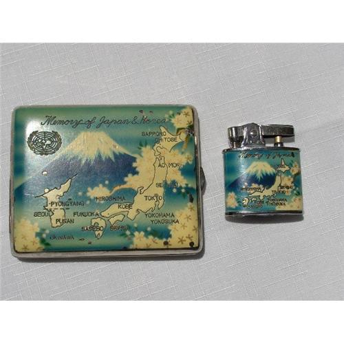 This is a Japanese novelty cigarette case & lighter. They have a pretty scene of Japan, and the cigarette case also has Korea, with many other cities etched on the front of each, with Mt. Fuji in the backgrounds. The graphics are in enamel paint. The inside of the case is chromed and has double springs on each side to hold the regular size cigarettes in place. Condition is good on the case, with some paint chips on the front and back due to age, there are no dents, the closure and springs fit tight like new. The lighter matches in scene and color, there are two small paint chips on front. The lighter was made by Elgin. Condition on the lighter is very good. This is a very nice set. Unusal treat to have the case and lighter together. Rare to be sold as a set. See photos. Have a look at my other items. Thank you for viewing.