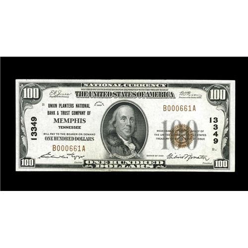 <B>Memphis, TN</B></I> - $100 1929 Ty. 1 <B>Union Planters NB & TC</B></I> Ch. # 13349<BR>Another bright and pretty example which is perfect for type. <B>Gem Crisp Uncirculated.</B></I>
