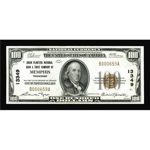 <B>Memphis, TN</B></I> - $100 1929 Ty. 1 <B>Union Planters NB & TC</B></I> Ch. # 13349<BR>A bright and well centered example of this always popular type note. <B>Gem Crisp Uncirculated.</B></I>