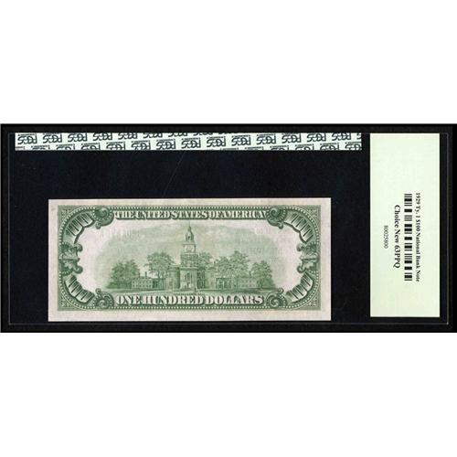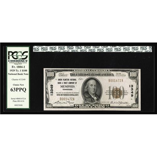 <B>Memphis, TN</B></I> - $100 1929 Ty. 1 <B>Union Planters NB & TC</B></I> Ch. # 13349<BR>Yet another example of this popular denomination from the home of Elvis that is somewhat tight at top right. <B>PCGS Choice New 63PPQ.</B></I>