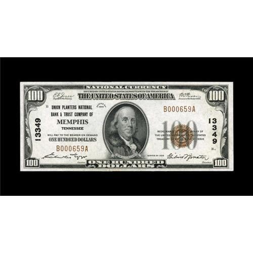 <B>Memphis, TN</B></I> - $100 1929 Ty. 1 <B>Union Planters NB & TC</B></I> Ch. # 13349<BR>A bright and well centered example of this always popular type note. <B>Gem Crisp Uncirculated.</B></I>