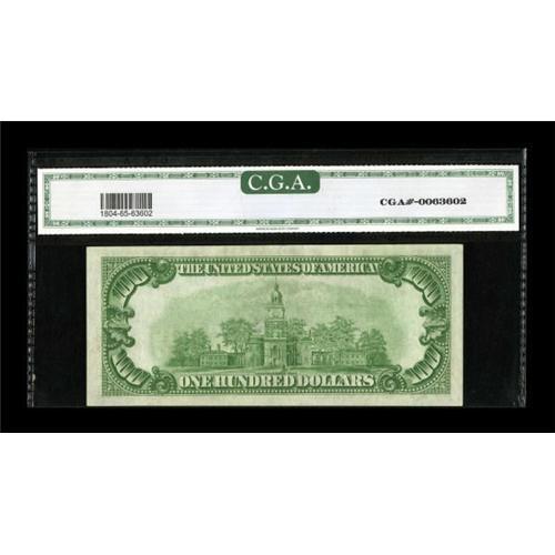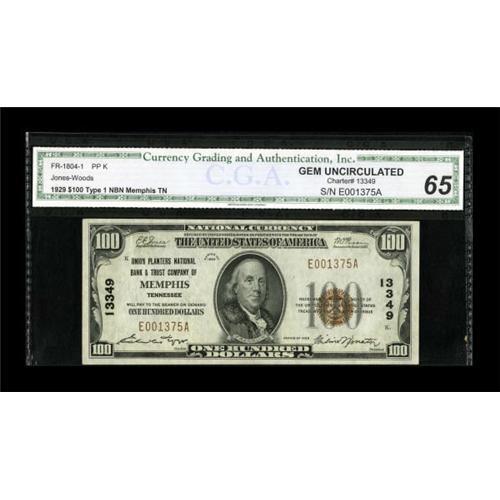 <B>Memphis, TN</B></I> - $100 1929 Ty. 1 <B>Union Planters NB & TC</B></I> Ch. # 13349<BR> A colorful and well centered example of this popular type note. <B>CGA Gem Uncirculated 65.</B></I><BR><BR><b>Shipping:</b> Coins & Currency (<a target="_blank" href="http://www.heritageauctions.com/common/shipping.php">view shipping information</a>)