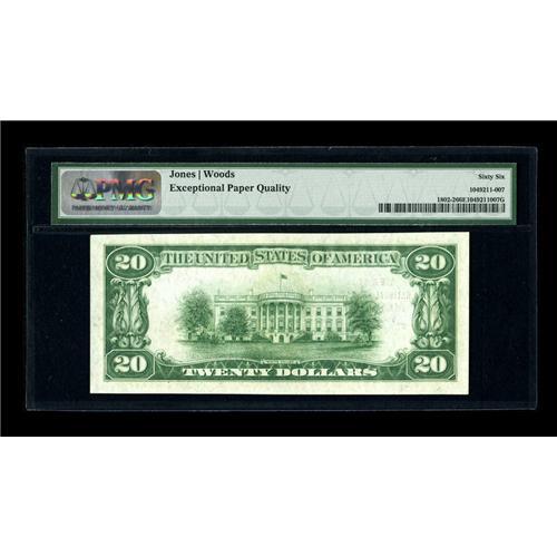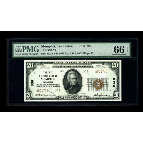 <B>Memphis, TN</B></I> - $20 1929 Ty. 2 <B>The First NB</B></I> Ch. # 336<BR>This is perhaps the finest known Type 2 example from here. Widely margined with plenty of originality, it grades PMG <B>Gem Uncirculated 66 EPQ.</B></I><BR><BR><b>Shipping:</b> Coins & Currency (<a target="_blank" href="http://www.heritageauctions.com/common/shipping.php">view shipping information</a>)
