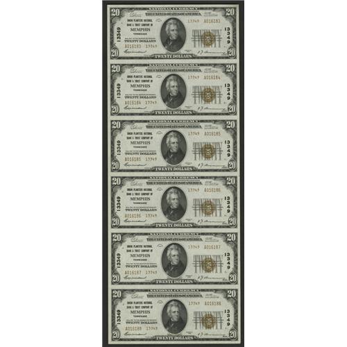 <B>Memphis, TN</B></I> - $20 1929 Ty. 2 <B>Union Planters NB & TC</B></I> Ch. # 13349 Uncut Sheet<BR>This is a well preserved sheet that is nicely centered. <B>Gem Crisp Uncirculated.</B></I><BR><BR><b>Shipping:</b> Coin/Currency (<a target="_blank" href="http://www.heritageauctions.com/common/shipping.php">view shipping information</a>)
