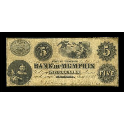 <B>Memphis, TN- Bank of Memphis</B></I> $5 June 1, 1854 Garland 551 G6a<BR> A very scarce note rated by Garland as Rarity 13. A nice child and dog vignette adorns the left side of the note. <B>Fine.</B></I><BR><BR><b>Shipping:</b> Coins & Currency (<a target="_blank" href="http://www.heritageauctions.com/common/shipping.php">view shipping information</a>)